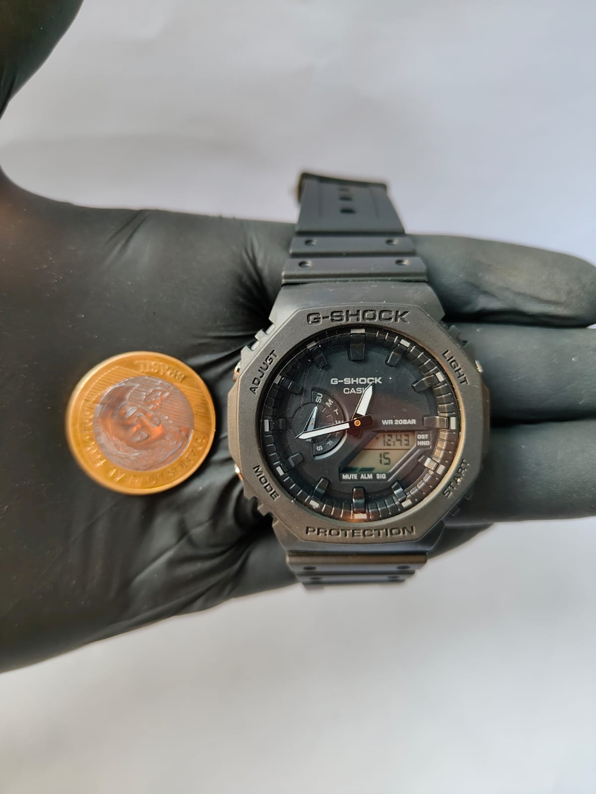 Este modelo é conhecido por seu design octogonal fino, que é uma homenagem ao primeiro G-Shock original, o DW-5000C. prova dágua 50m, adequado para banho frio, serviços de casa, lavar carro, e chuva. Automático, lanterna forte, gravado em alto relevo, Data, Fuso horário.