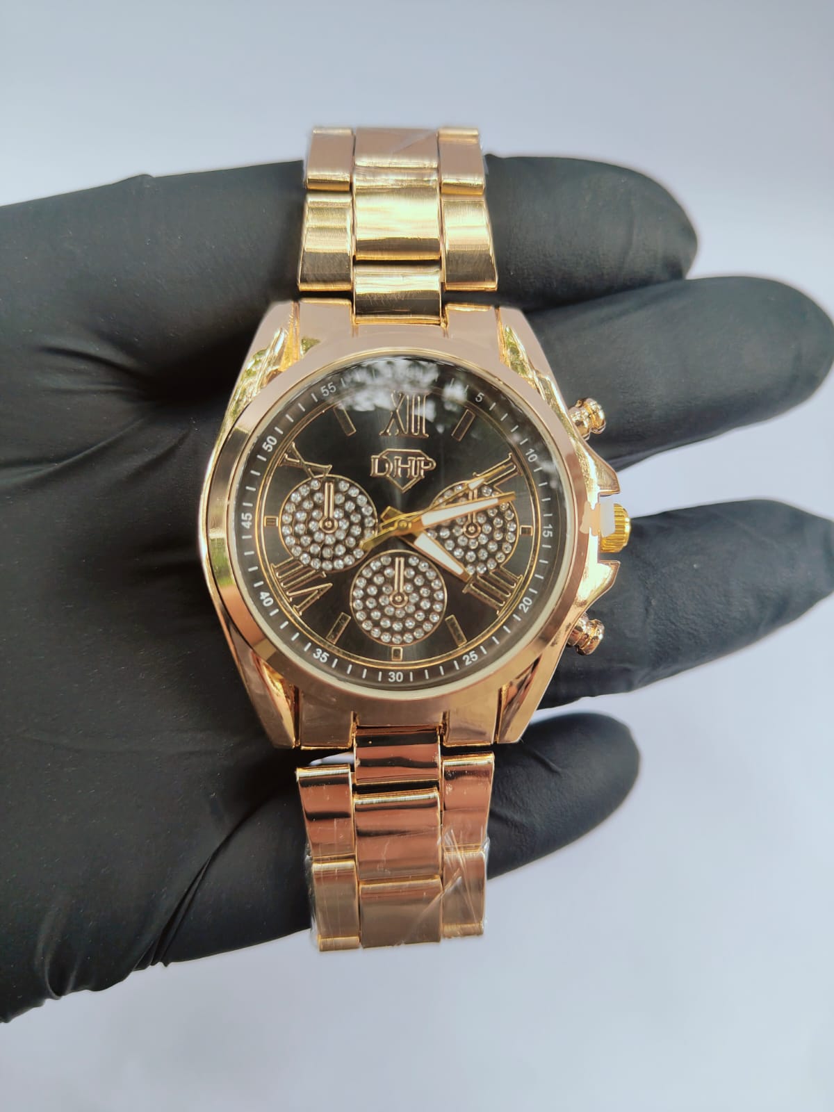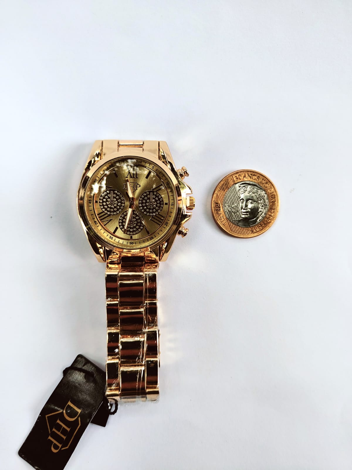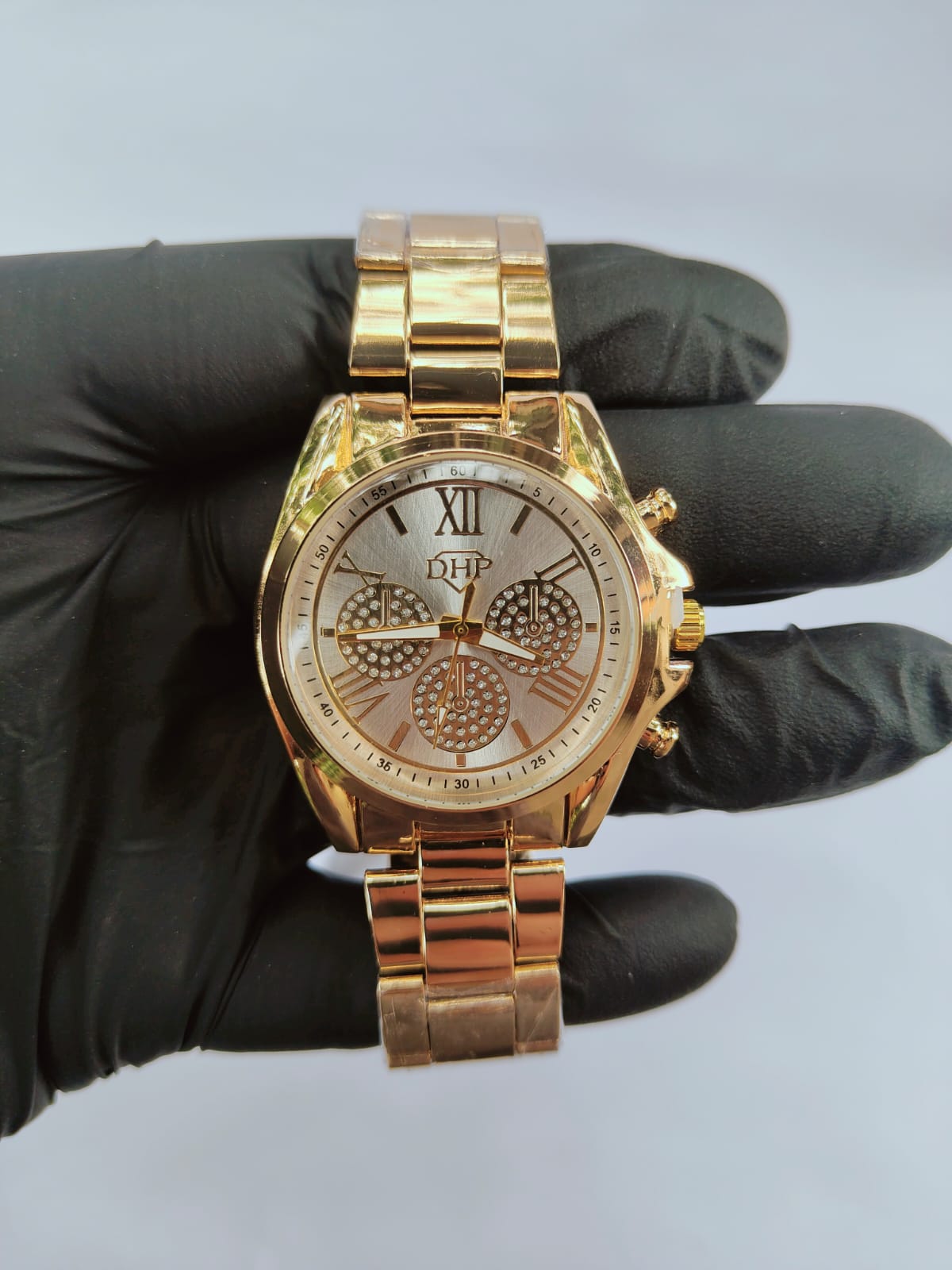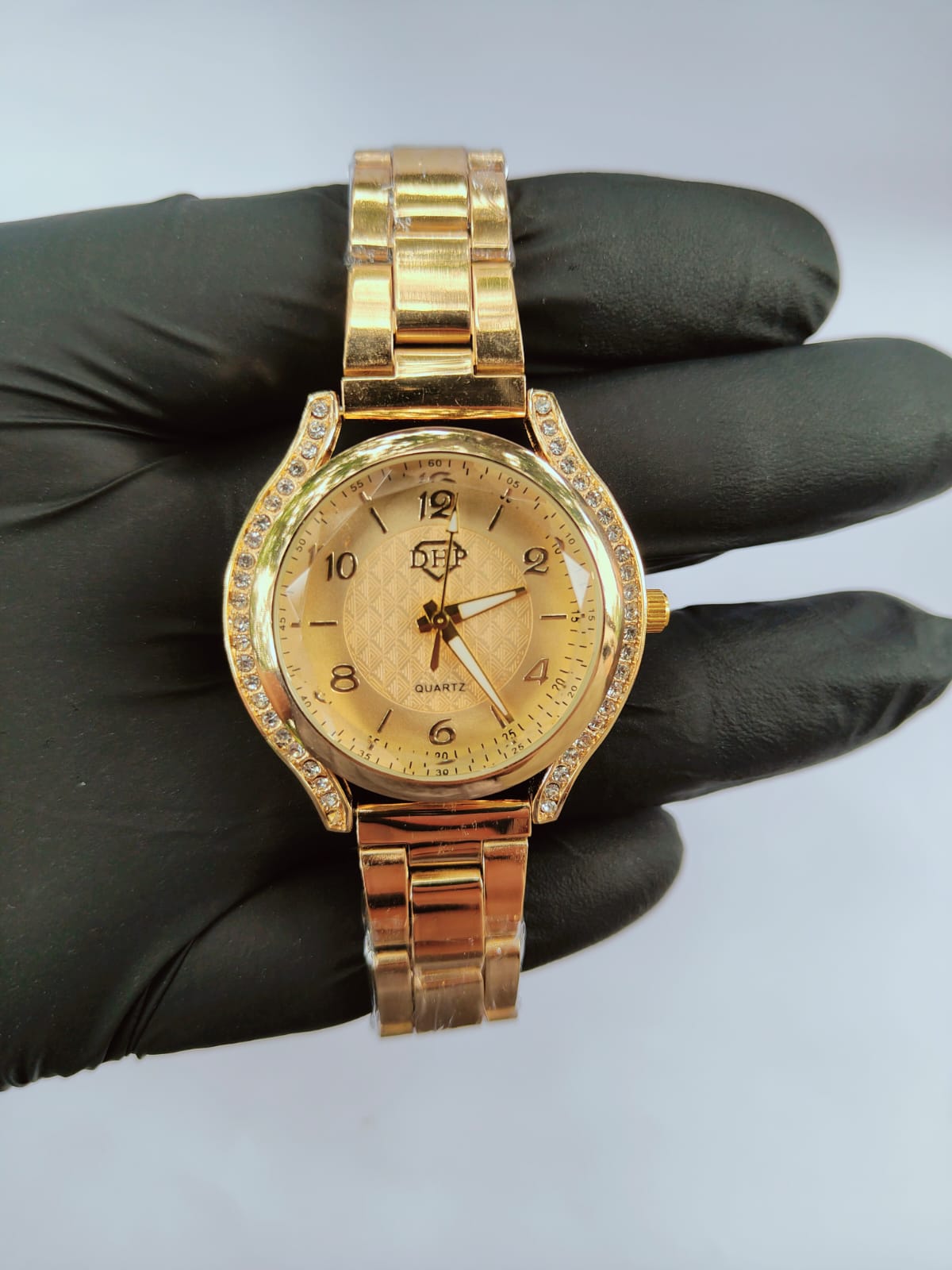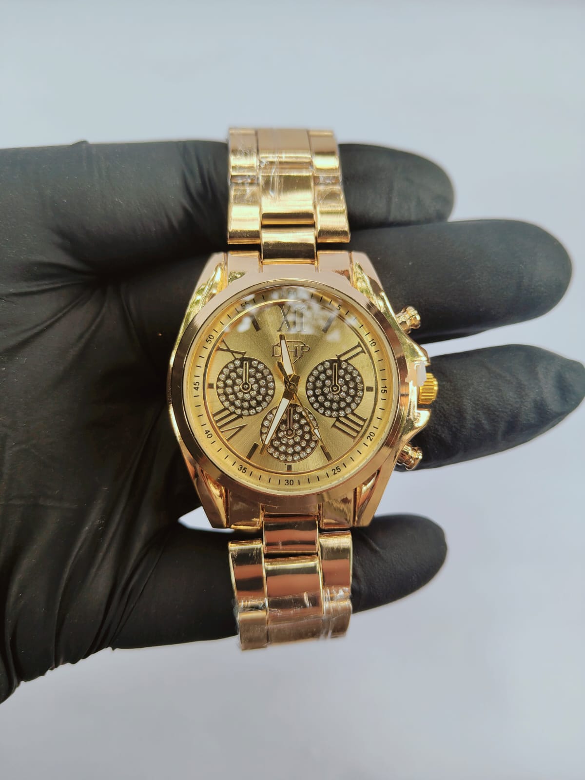 Relógio de luxo elegante, com pulseira e caixa em dourado brilhante e mostrador decorado com pequenos cristais que dão um toque sofisticado. Ele tem um design que remete mais a ocasiões formais e sociais, passando bastante refinamento e exclusividade. prova dágua 50m, adequado para banho frio, serviços de casa, lavar carro, e chuva. Ainda melhor para enfeitar o seu estilo.