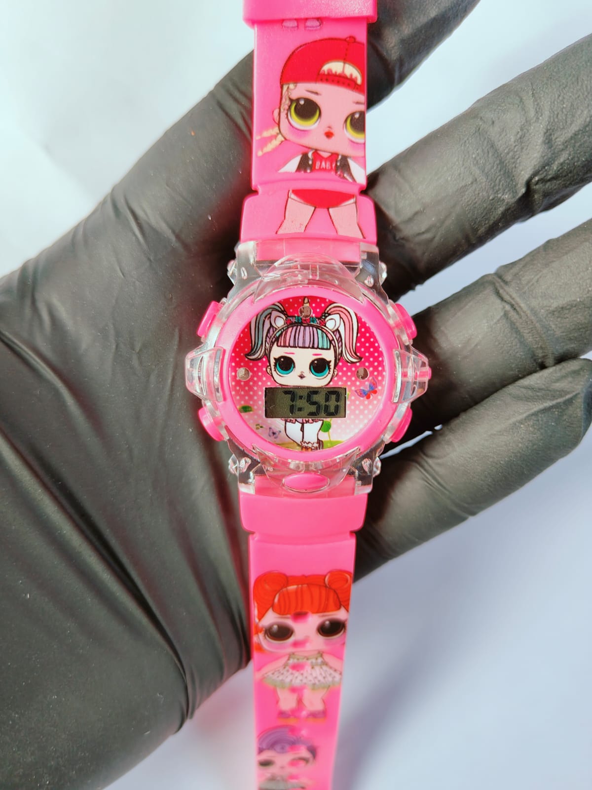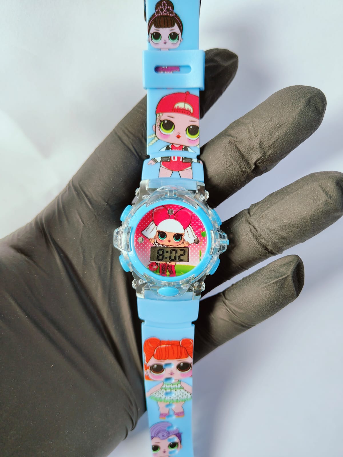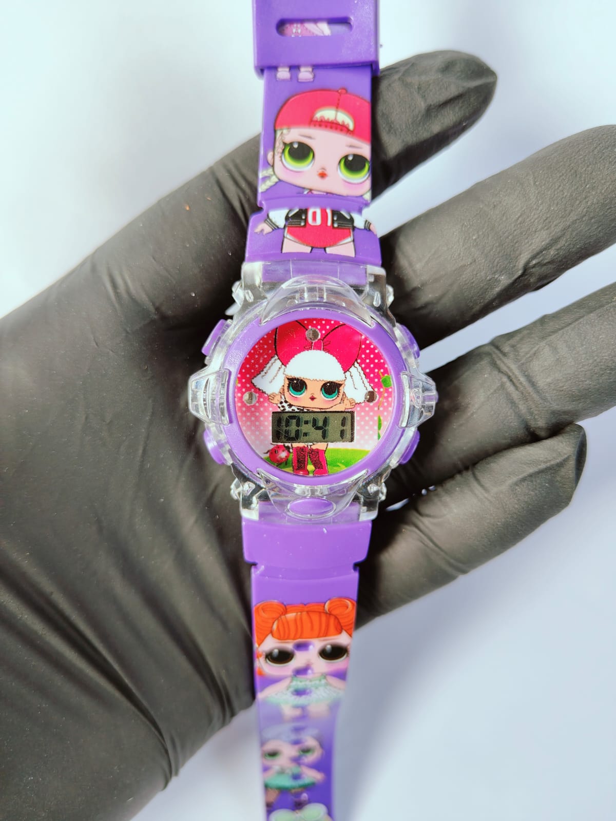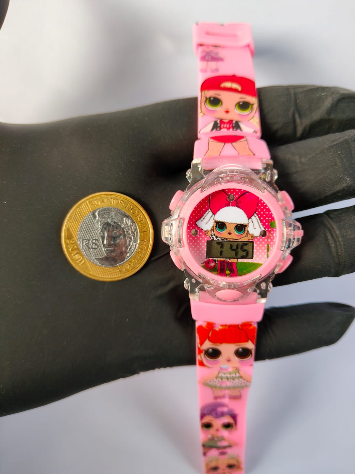 Este relógio digital infantil da L.O.L. pisca luzes coloridas de LED e toca música. É um acessório divertido com design fofo, ideal para presentear, que combina a funcionalidade de um relógio com elementos interativos de luz e som para encantar as crianças. Não possui resistência à água.