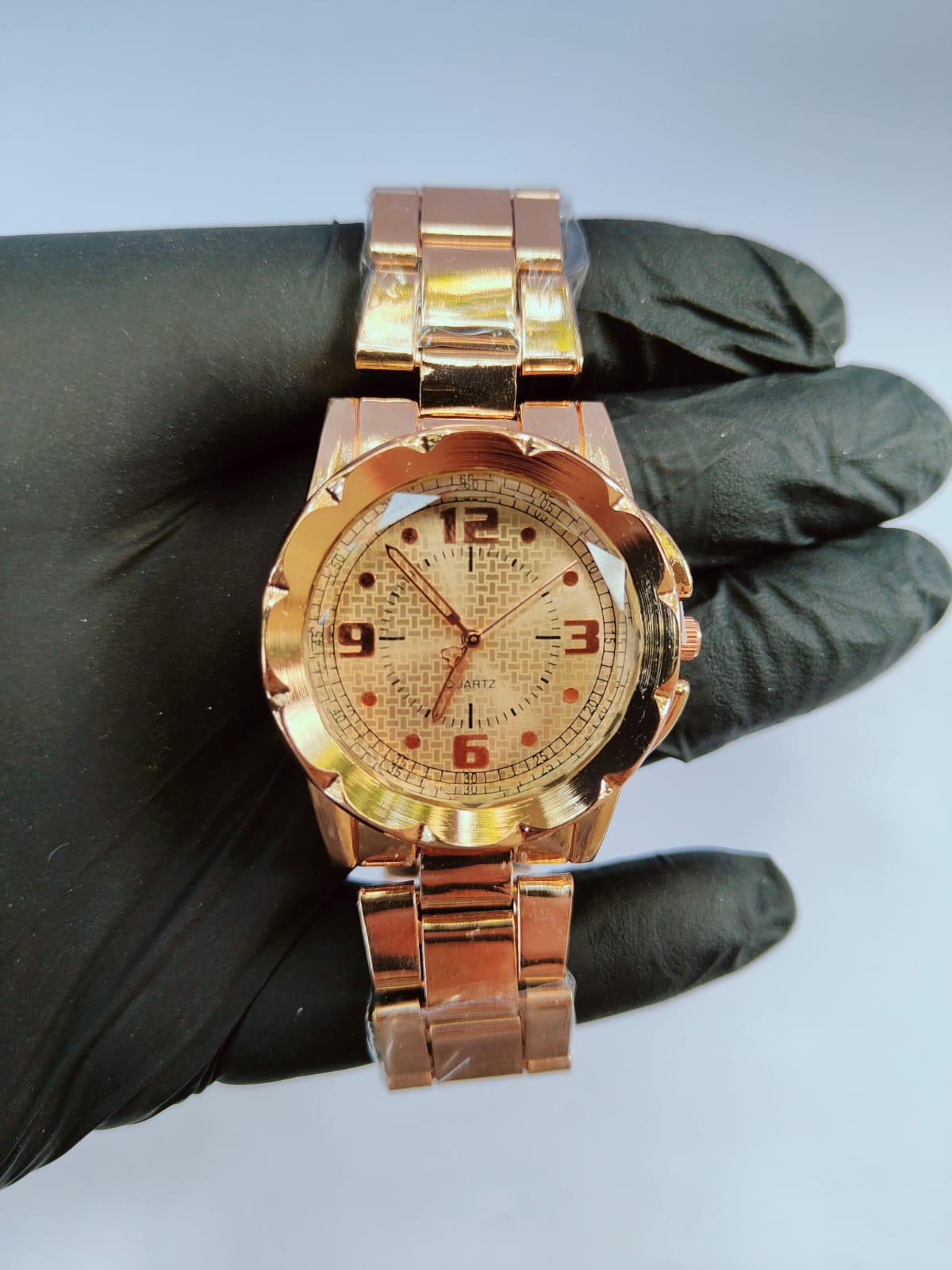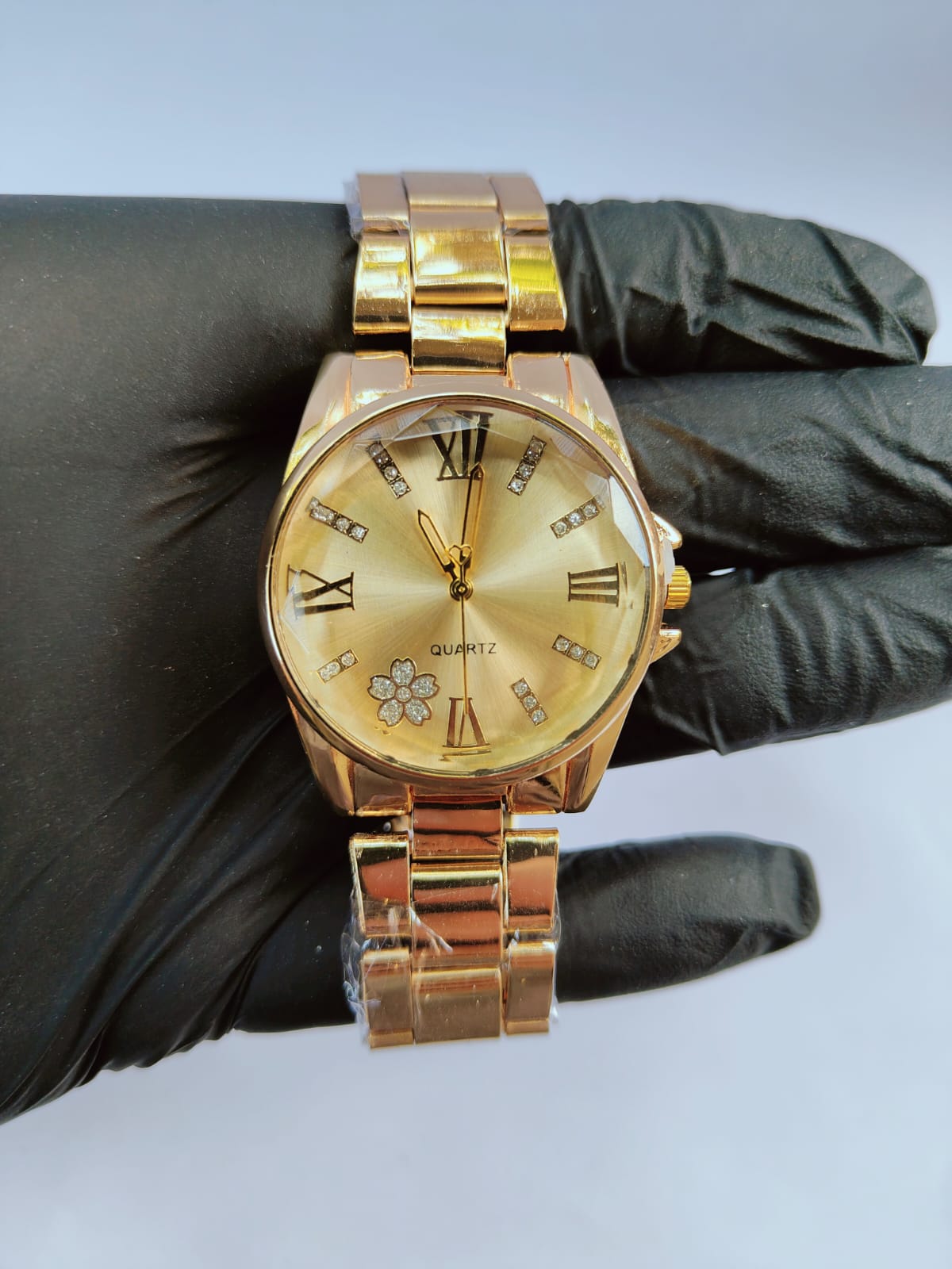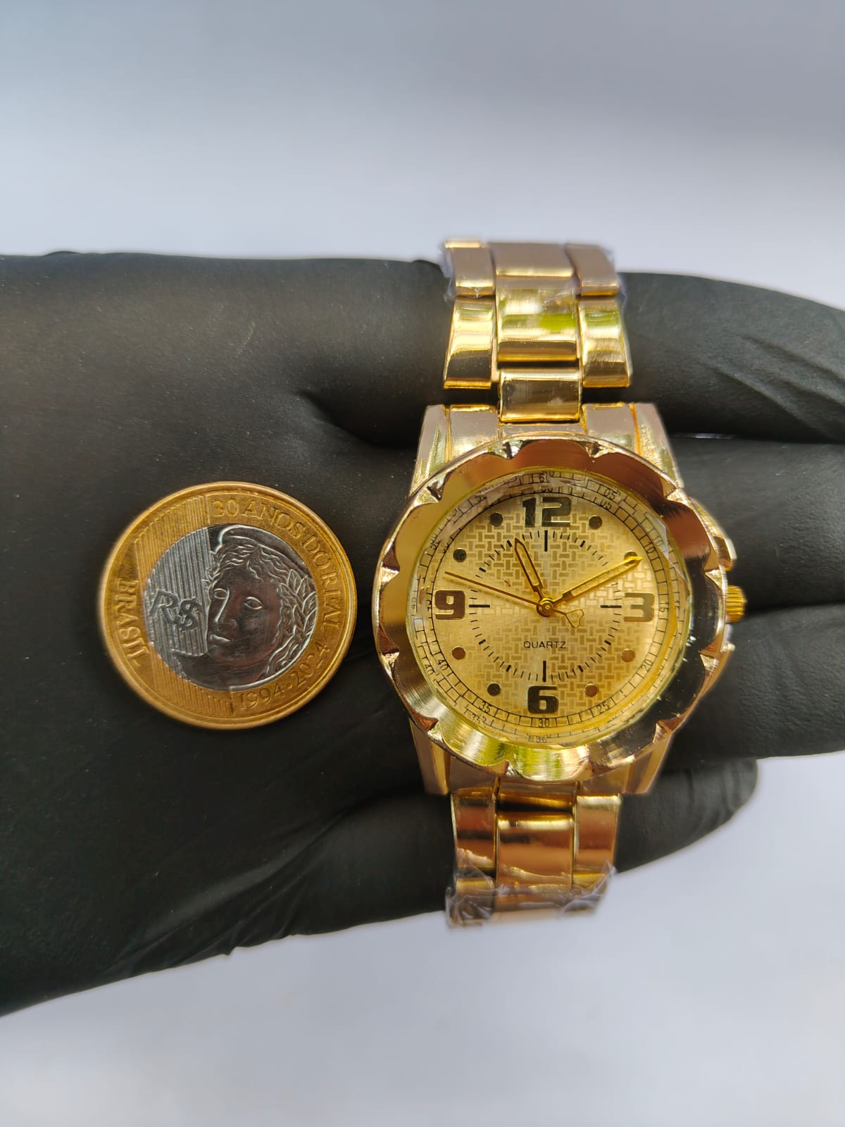 Modelo com aro em formato de pétalas, mostrador com textura e o visual chamativo. Não possui resistência à água.