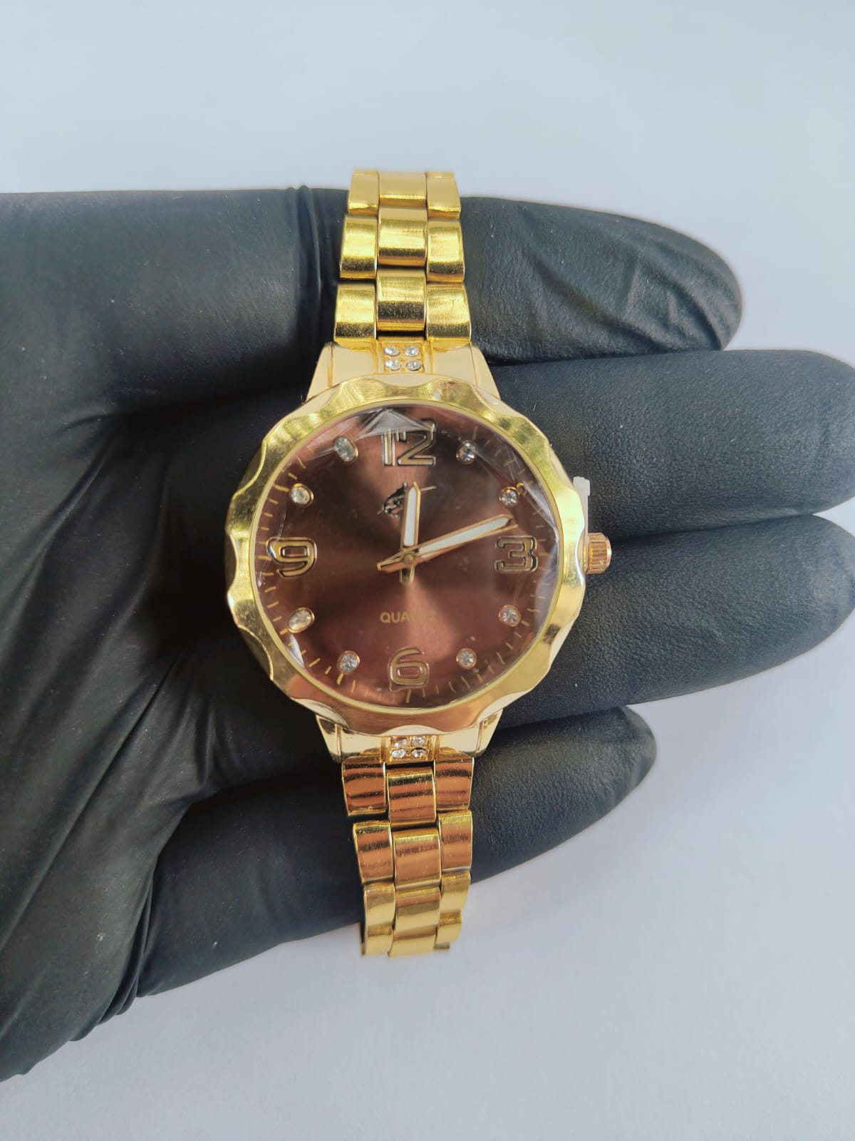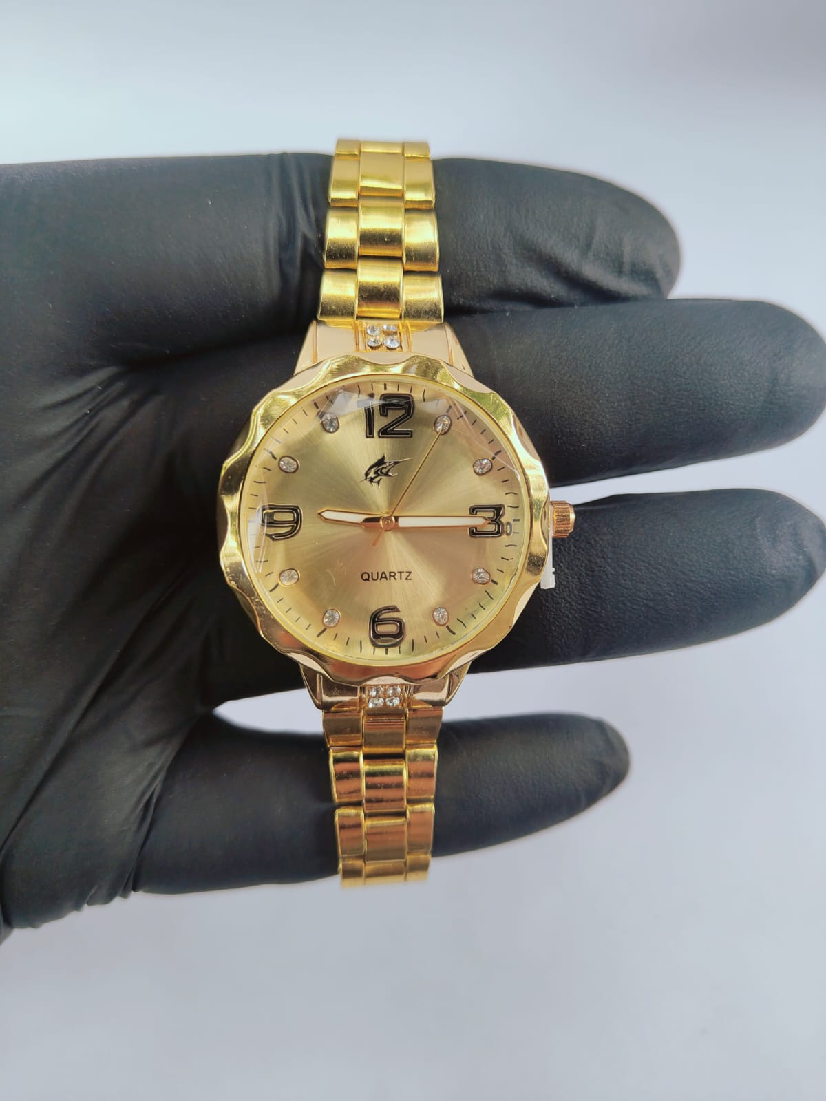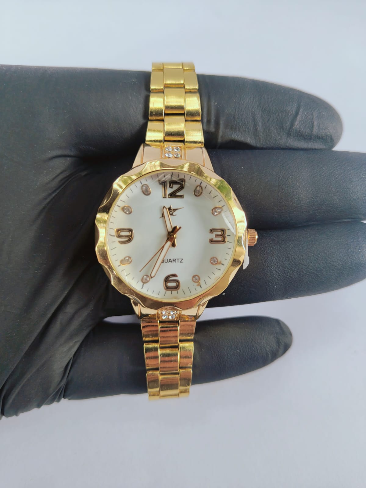 Refine seu estilo com este modelo elegante que combina delicadeza e presença. O mostrador dourado com marcadores em strass traz sofisticação, enquanto a pulseira metálica garante um visual moderno e refinado. prova dágua 50m, adequado para banho frio, serviços de casa, lavar carro, e chuva.