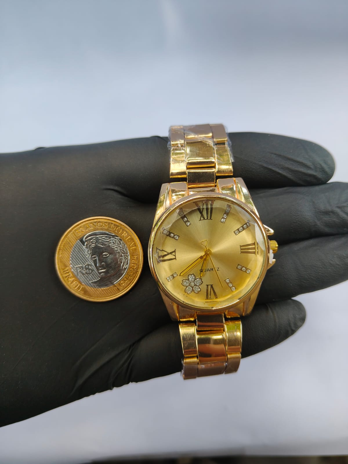 Este modelo possui um design elegante e dourado com detalhes em strass e um pequeno adorno floral no mostrador. Não possui resistência à água.
