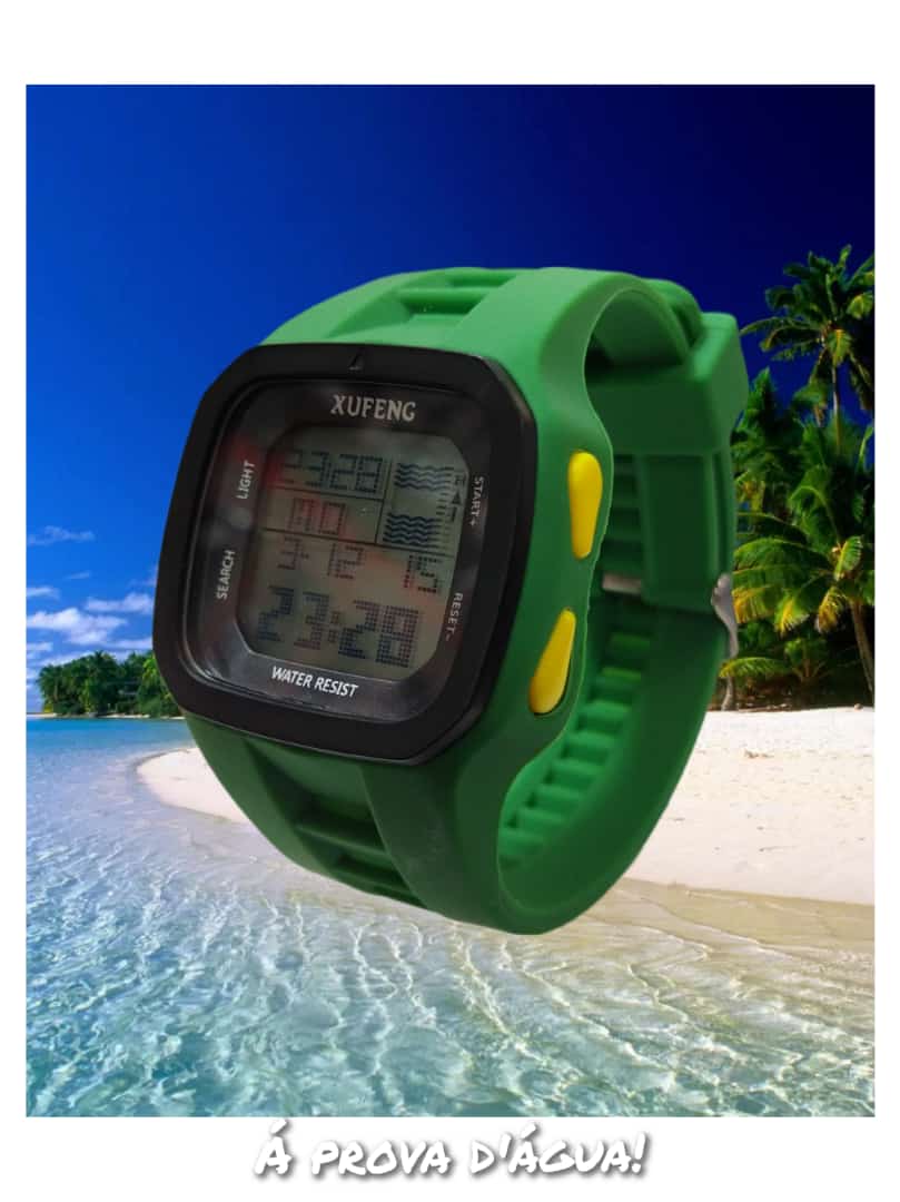 Características: Possui funções como cronômetro, alarme e luz de LED. A caixa e a pulseira são geralmente feitas de resina ou borracha.